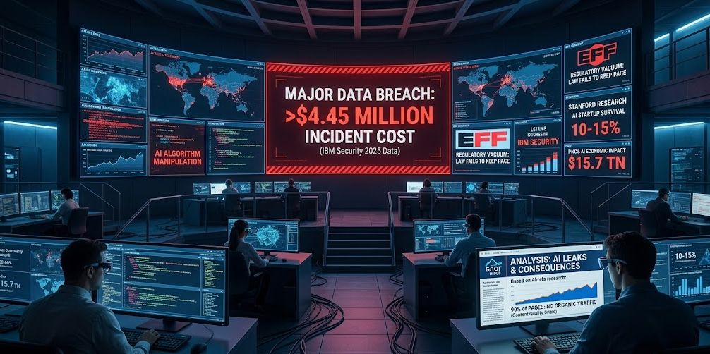 Паралельно з розвитком ринку зростає і кількість скандалів. Інциденти з AI-проєктами, витоки даних і маніпуляції алгоритмами стають новою нормою. За даними IBM Security, середня вартість витоку даних у 2025 році досягла $4,45 млн — історичний максимум.